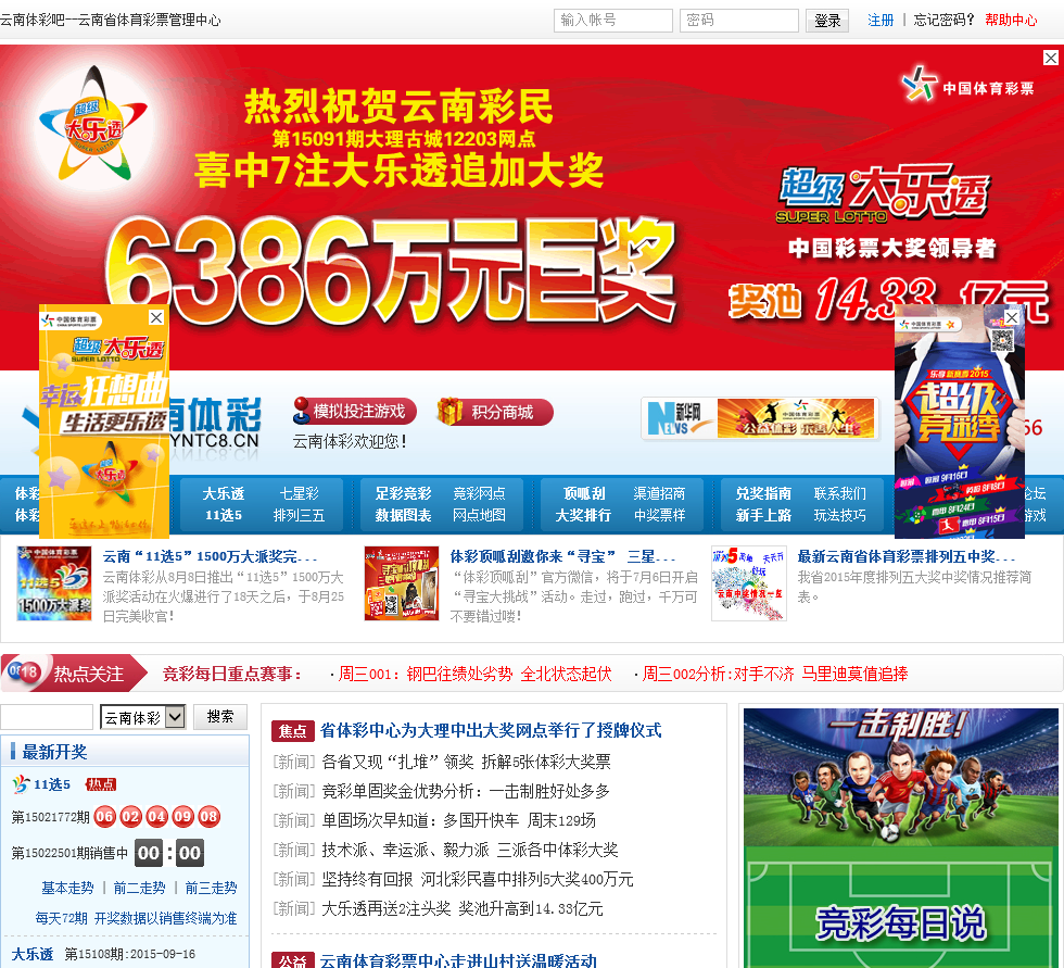 云南体育彩票管理中心网站。发布开奖信息、官方公告、数据中心、体彩资讯、开奖视频,为彩民提供超级大乐透、排列三、排列五、七星彩、足彩等彩种资讯服务