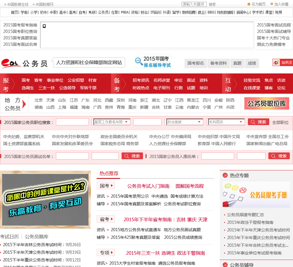 中国教育在线公务员考试频道、公务员考试网授权发布2015公务员考试信息:公务员报名,公务员考试时间,公务员面试,公务员试题、公务员职位表等,是中国人力资源和社会保障部指定国家公务员信息发布平台