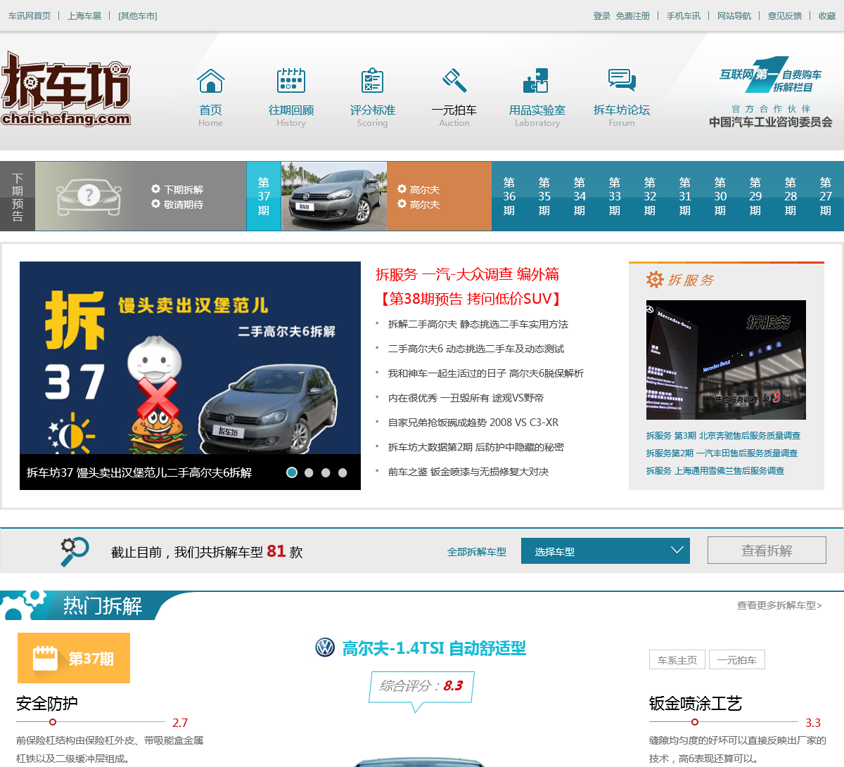 基于打造“值得信赖汽车网站”的理念,车讯网创办了《拆车坊》栏目,目的就是帮助消费者“精明买车 明白用车”。从2011年12月开始,《拆车坊》栏目将每月推出一期,每期拆解两辆市场热销车型,均为车讯网全资购买的在4s店批量销售的新车,整个测试和研究过程由清华大学汽车系专家教授亲手操作,并每期对媒体公布实...