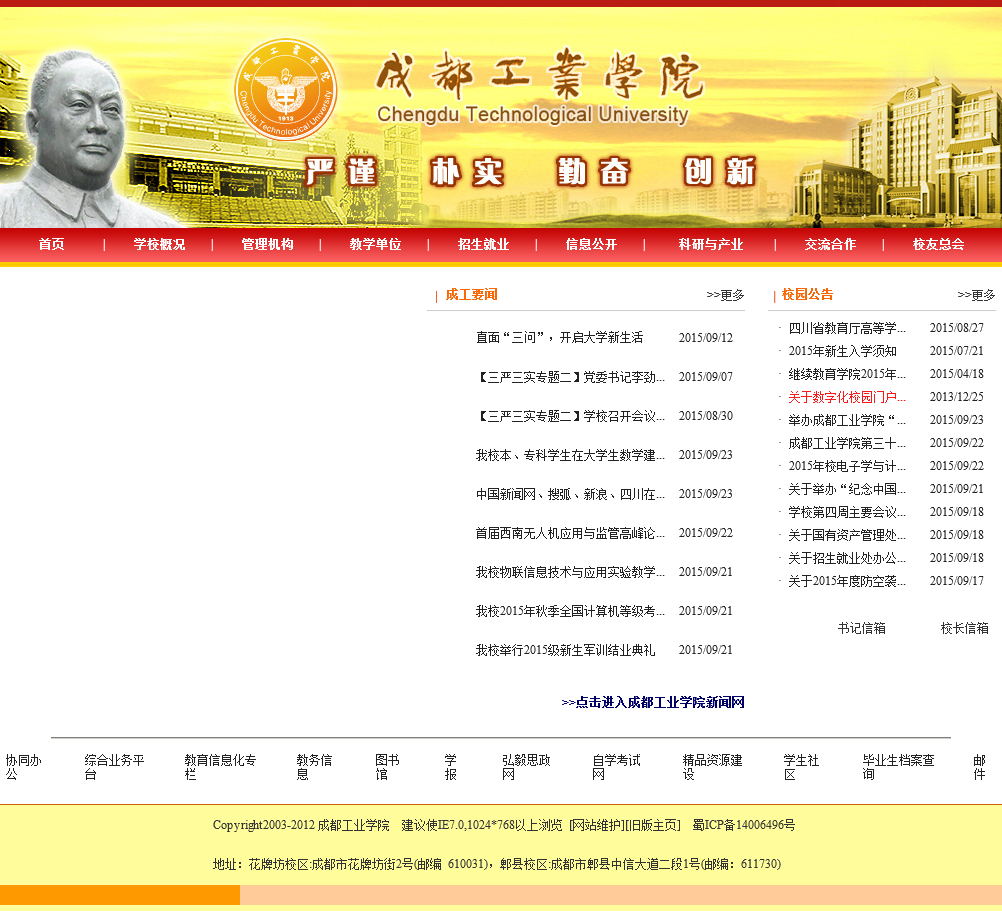 成都工业学院于2020-09-22被0702投稿网收录,网站相关信息来自互联网或网友分享!由于(成都工业学院)网站内容动态属性,时刻在变动,本站无法保证(成都工业学院)网站内容真实可靠!请大家查阅时,谨慎选择、自辩真伪,感谢您的理解与支持。如果您在访问(成都工业学院)时发现:网址失效、或网站存在非法等相关内容,请及时联系我们,我们会第一时间处理。