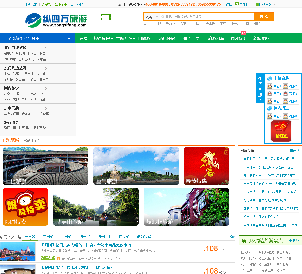 厦门旅行社纵四方提供厦门旅游,周边旅游,国内旅游,一日二日游线路推荐,厦门旅游攻略,旅游景点大全,门票预订,酒店住宿,租车,厦门自助游等.电话4006618600★★★★★