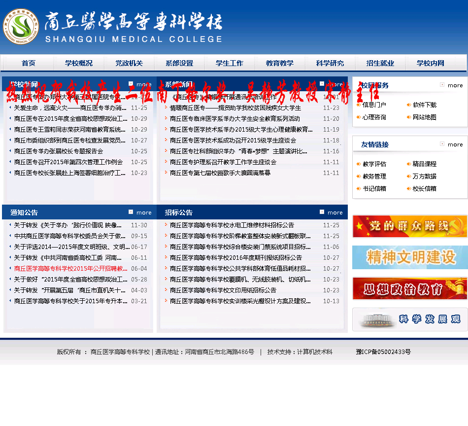 商丘医学高等专科学校于2020-09-23被0702投稿网收录,网站相关信息来自互联网或网友分享!由于(商丘医学高等专科学校)网站内容动态属性,时刻在变动,本站无法保证(商丘医学高等专科学校)网站内容真实可靠!请大家查阅时,谨慎选择、自辩真伪,感谢您的理解与支持。如果您在访问(商丘医学高等专科学校)时发现:网址失效、或网站存在非法等相关内容,请及时联系我们,我们会第一时间处理。