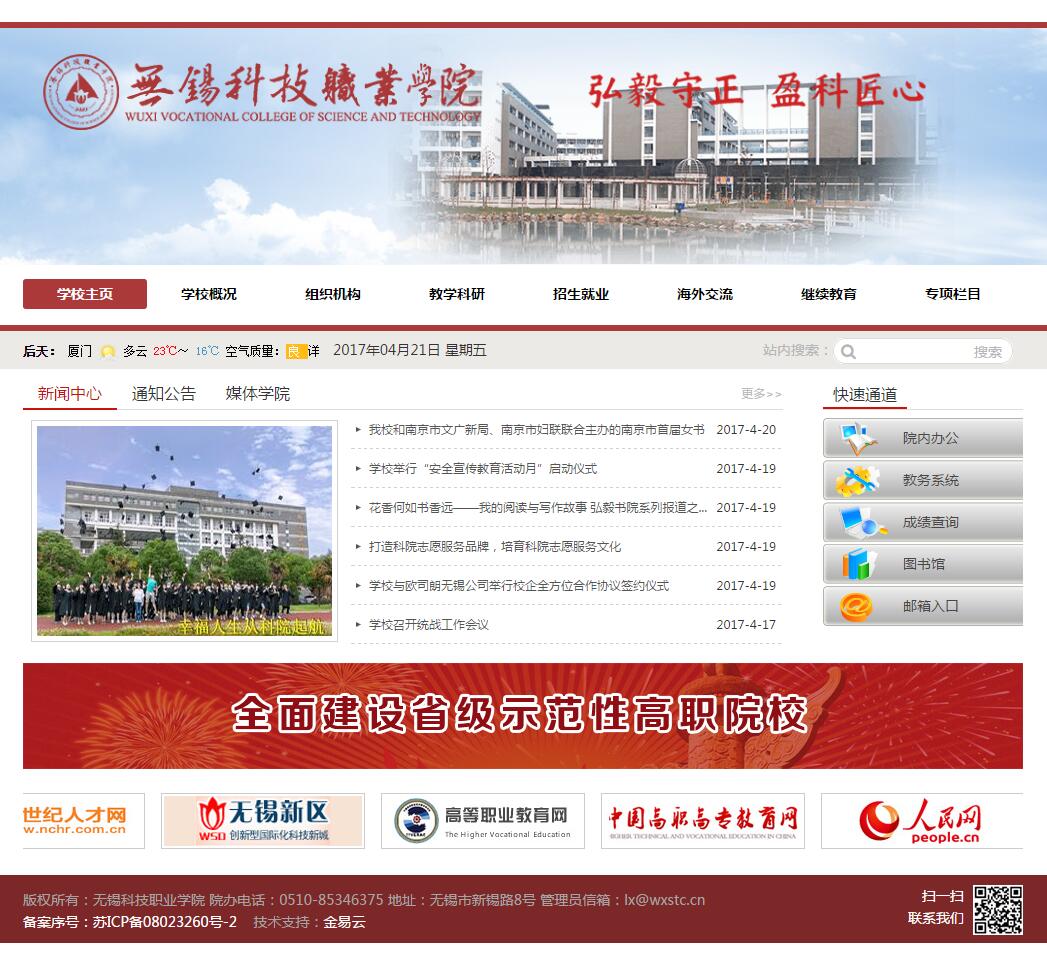 无锡科技职业学院于2020-09-26被0702投稿网收录,网站相关信息来自互联网或网友分享!由于(无锡科技职业学院)网站内容动态属性,时刻在变动,本站无法保证(无锡科技职业学院)网站内容真实可靠!请大家查阅时,谨慎选择、自辩真伪,感谢您的理解与支持。如果您在访问(无锡科技职业学院)时发现:网址失效、或网站存在非法等相关内容,请及时联系我们,我们会第一时间处理。