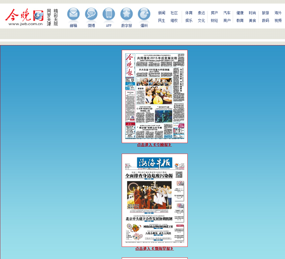 今晚网-多媒体数字报刊平台,今晚传媒集团主办。共有四份报纸:今晚报,渤海早报,经济周报,老年时报。内容涉及:新闻,经济,金融,房产,娱乐,足球,足彩,小说,数码家电,情感,动漫,滨海,警法,健康,教育,财富,圈子,汽车等多个方面。