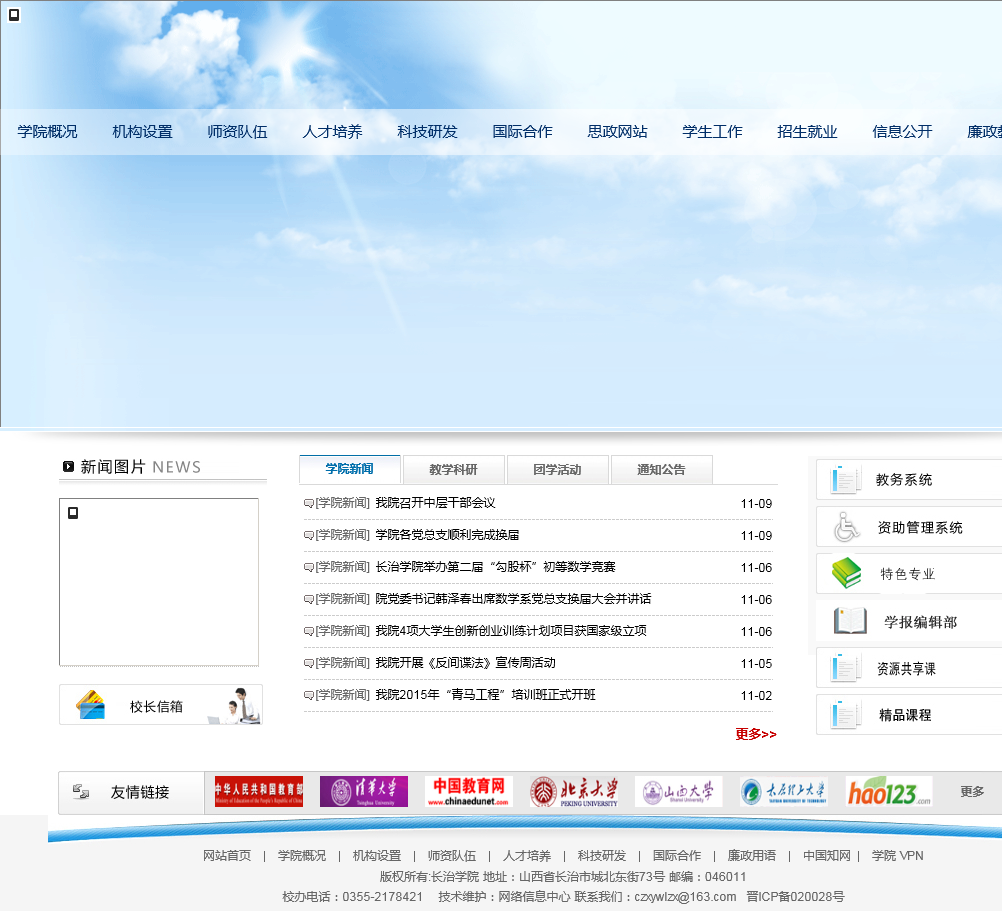 长治学院于2020-09-28被0702投稿网收录,网站相关信息来自互联网或网友分享!由于(长治学院)网站内容动态属性,时刻在变动,本站无法保证(长治学院)网站内容真实可靠!请大家查阅时,谨慎选择、自辩真伪,感谢您的理解与支持。如果您在访问(长治学院)时发现:网址失效、或网站存在非法等相关内容,请及时联系我们,我们会第一时间处理。