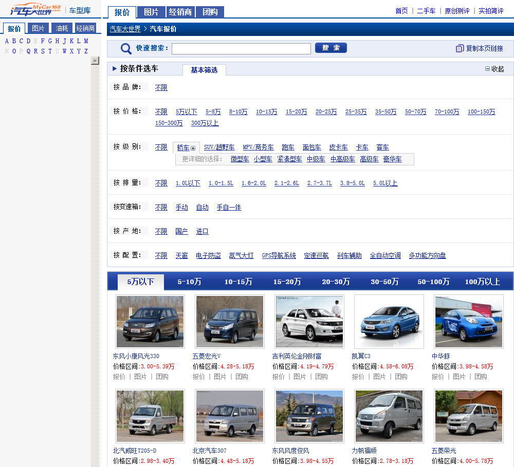 汽车大世界网站车型报价频道为您提供新全的汽车报价,包括厂家指导价,车身价,包牌价,新报价,低报价,高报价和平均报价,各品牌车型的汽车报价以及排行报价信息等,新真实的汽车经销商报价,在这车型报价库您可以按车价作为查询条件找到您想要的车。