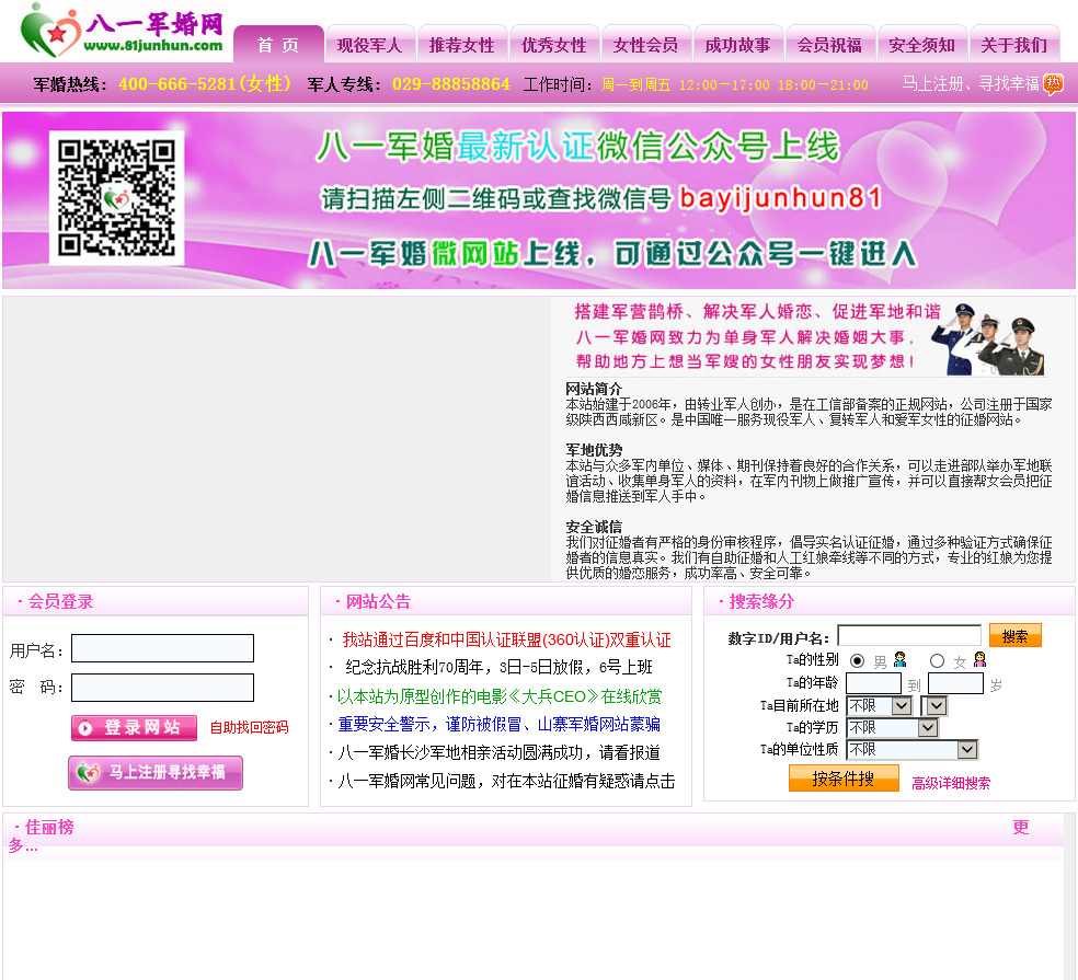 八一军婚网于2020-10-01被0702投稿网收录,网站相关信息来自互联网或网友分享!由于(八一军婚网)网站内容动态属性,时刻在变动,本站无法保证(八一军婚网)网站内容真实可靠!请大家查阅时,谨慎选择、自辩真伪,感谢您的理解与支持。如果您在访问(八一军婚网)时发现:网址失效、或网站存在非法等相关内容,请及时联系我们,我们会第一时间处理。