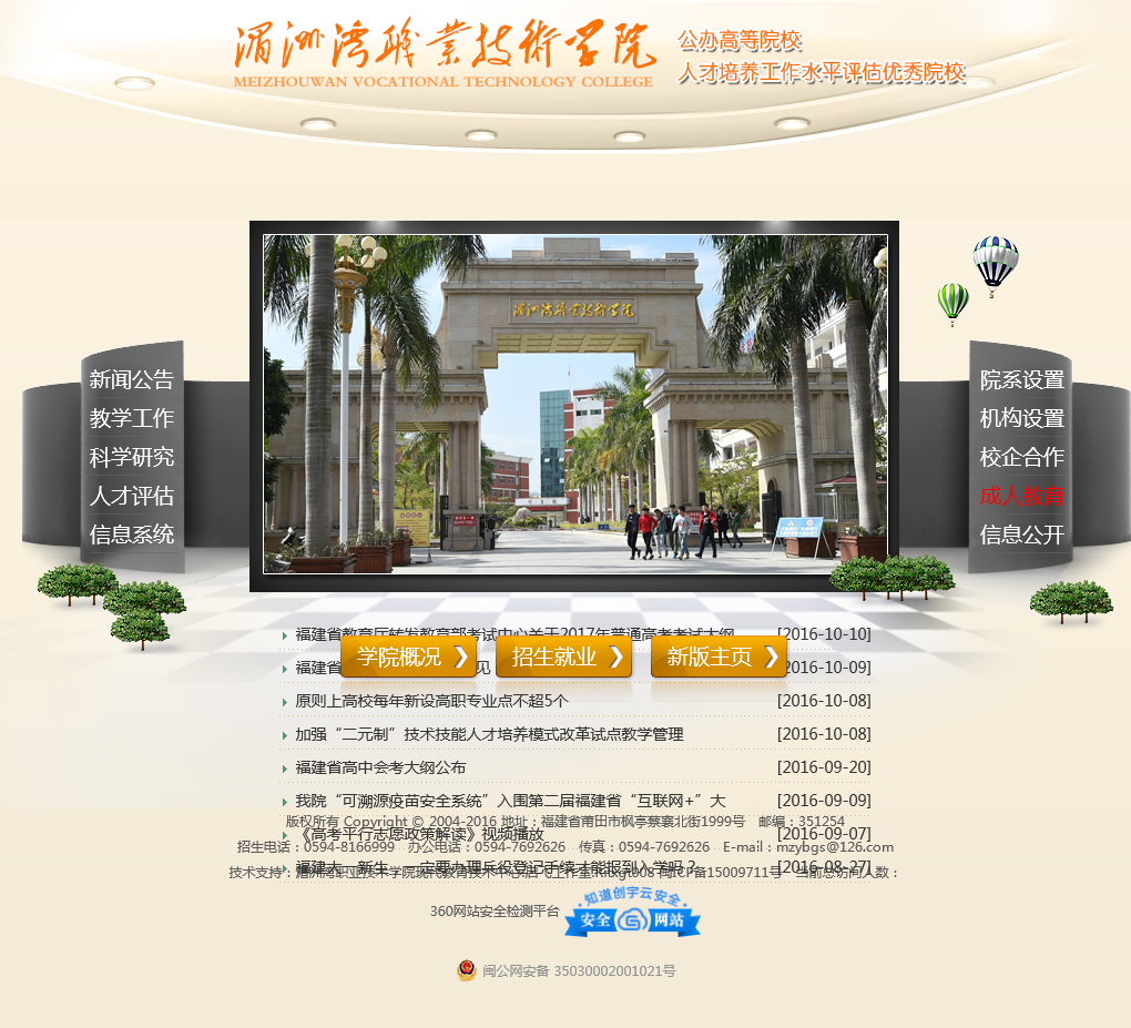 湄洲湾职业技术学院于2020-10-02被0702投稿网收录,网站相关信息来自互联网或网友分享!由于(湄洲湾职业技术学院)网站内容动态属性,时刻在变动,本站无法保证(湄洲湾职业技术学院)网站内容真实可靠!请大家查阅时,谨慎选择、自辩真伪,感谢您的理解与支持。如果您在访问(湄洲湾职业技术学院)时发现:网址失效、或网站存在非法等相关内容,请及时联系我们,我们会第一时间处理。