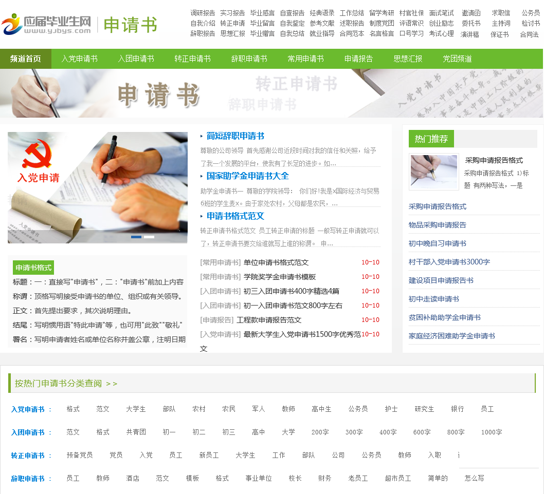 申请书范文网优质提供多种申请书范文,包括入党申请书、入党申请书范文、入团申请书、入团申请书范文、转正申请书、转正申请书范文、辞职申请书、辞职申请书范文,还有各种申请书格式及申请书模板,为您撰写申请书提供指导帮助,更多申请书,尽在申请书范文网(shenqingshu.yjbys.com)。
