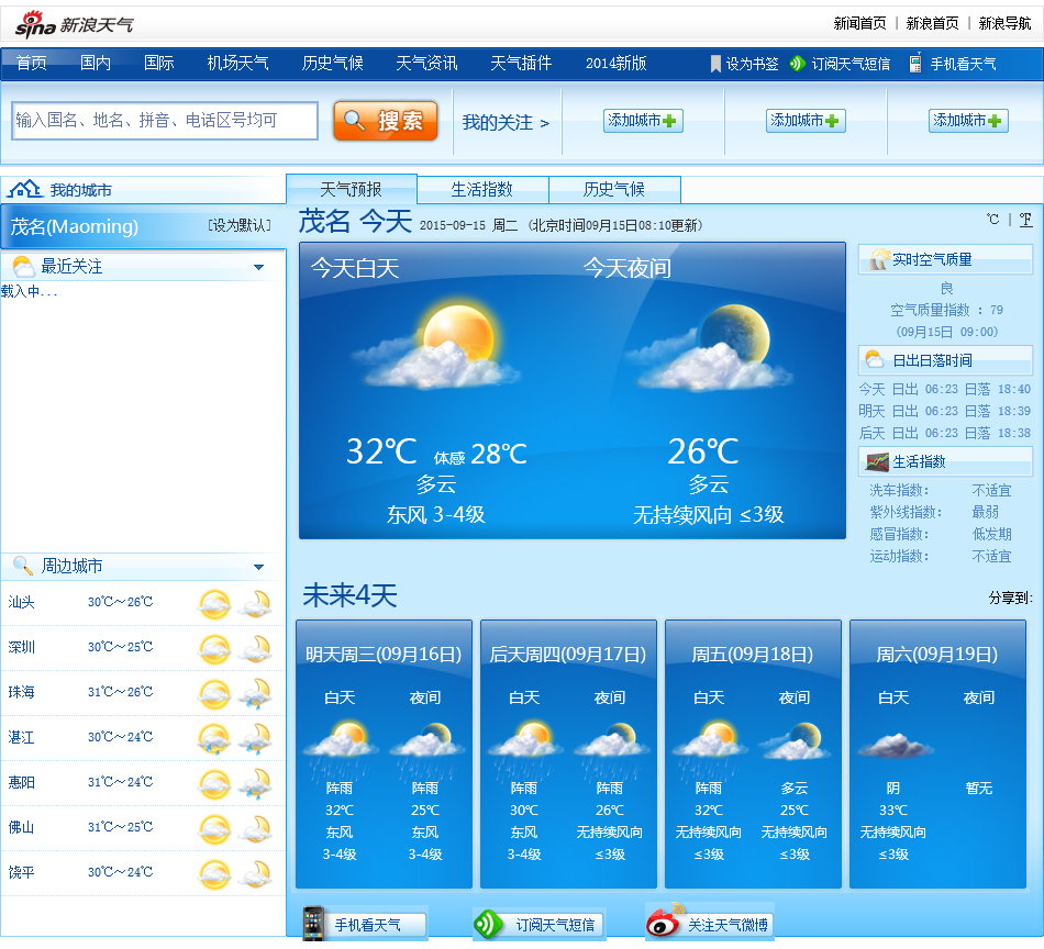 新浪天气频道于2020-10-03被0702投稿网收录,网站相关信息来自互联网或网友分享!由于(新浪天气频道)网站内容动态属性,时刻在变动,本站无法保证(新浪天气频道)网站内容真实可靠!请大家查阅时,谨慎选择、自辩真伪,感谢您的理解与支持。如果您在访问(新浪天气频道)时发现:网址失效、或网站存在非法等相关内容,请及时联系我们,我们会第一时间处理。
