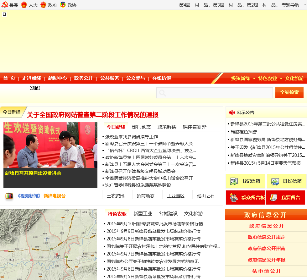 新绛政府网是发布权威政务信息,提供在线服务,与公众互动交流的信息平台,主要有新绛新闻,新绛旅游,绛州文化,特色农业,投资新绛,书记信箱,县长信箱等栏目