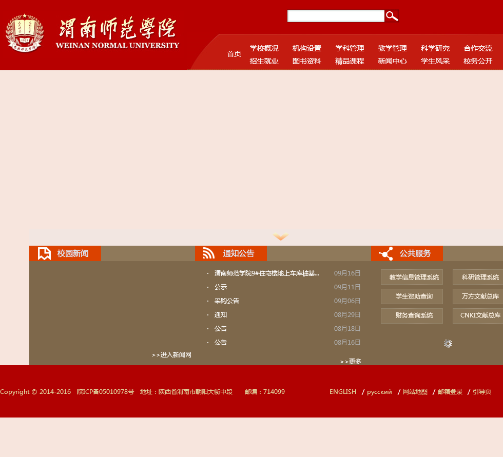 渭南师范学院于2020-10-08被0702投稿网收录,网站相关信息来自互联网或网友分享!由于(渭南师范学院)网站内容动态属性,时刻在变动,本站无法保证(渭南师范学院)网站内容真实可靠!请大家查阅时,谨慎选择、自辩真伪,感谢您的理解与支持。如果您在访问(渭南师范学院)时发现:网址失效、或网站存在非法等相关内容,请及时联系我们,我们会第一时间处理。
