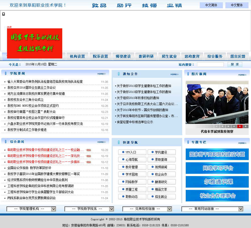阜阳职业技术学院于2020-10-11被0702投稿网收录,网站相关信息来自互联网或网友分享!由于(阜阳职业技术学院)网站内容动态属性,时刻在变动,本站无法保证(阜阳职业技术学院)网站内容真实可靠!请大家查阅时,谨慎选择、自辩真伪,感谢您的理解与支持。如果您在访问(阜阳职业技术学院)时发现:网址失效、或网站存在非法等相关内容,请及时联系我们,我们会第一时间处理。