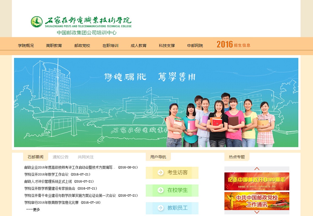 石家庄邮电职业技术学院始建于1956年,现隶属中国邮政集团公司,是中国唯一培养邮政专门人才的高等院校,同时是中国邮政集团公司培训中心、中国邮政集团公司党校、远程教育中心、信息灾备中心和重要的科技研发基地。建校50多年来,学院始终坚持“支撑邮政、服务通信、贡献社会”的办学宗旨,始终致力于邮电行业专...