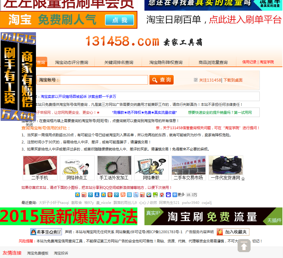 131458.com卖家工具箱信誉查询网站,免费提供淘宝买家信誉查询、淘宝卖家信誉查询、淘宝信用等级查询等各项淘宝信誉查询服务,是淘宝防降权、淘宝小号查询必备工具箱。