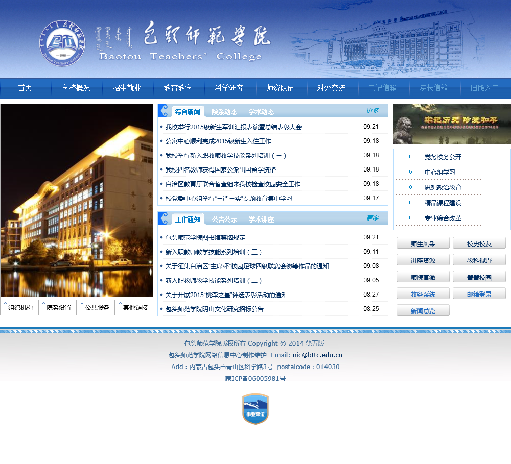 包头师范学院于2020-10-13被0702投稿网收录,网站相关信息来自互联网或网友分享!由于(包头师范学院)网站内容动态属性,时刻在变动,本站无法保证(包头师范学院)网站内容真实可靠!请大家查阅时,谨慎选择、自辩真伪,感谢您的理解与支持。如果您在访问(包头师范学院)时发现:网址失效、或网站存在非法等相关内容,请及时联系我们,我们会第一时间处理。