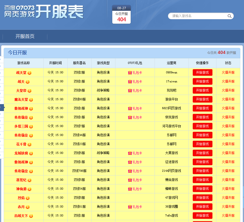 中国网页游戏开服表,是国内优秀的网页游戏开服表,提供新网页游戏开服信息、网页游戏大全、新网页游戏开服预告,为玩家提供准确的网页游戏开服表信息。