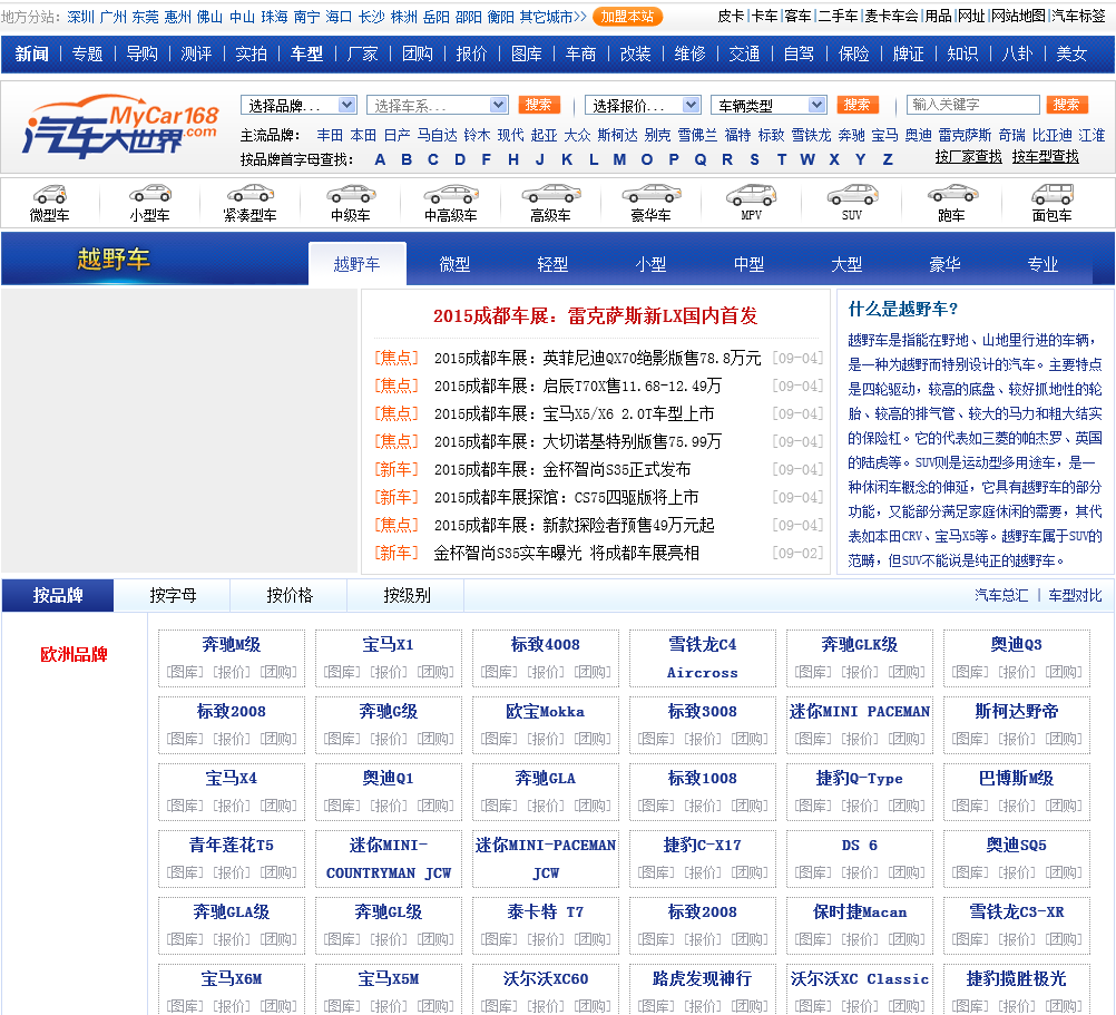 车型库,揽括了越野车品牌,包括车型名称及图片,参数配置,车型评价,经销商,专卖店,4S店,并有各车型报价,图片,论坛(车友俱乐部),二手车等