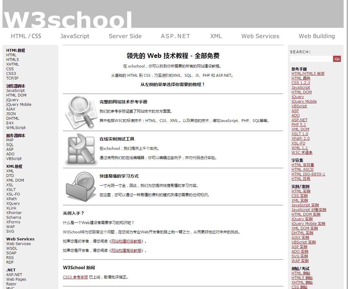 w3school 在线教程(www.w3school.com.cn)在w3school,你可以找到你所需要的所有的网站建设教程。从基础的HTML到XHTML,乃至进阶的XML、SQL、数据库、多媒体和WAP。