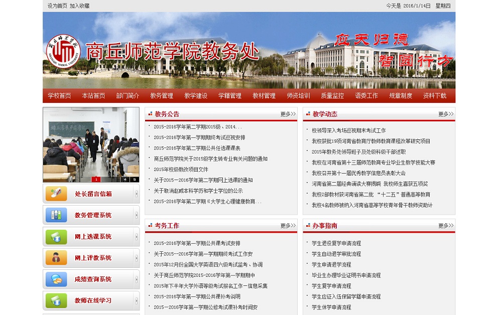 商丘师范学院教务处于2020-05-27被0702投稿网收录,网站相关信息来自互联网或网友分享!由于(商丘师范学院教务处)网站内容动态属性,时刻在变动,本站无法保证(商丘师范学院教务处)网站内容真实可靠!请大家查阅时,谨慎选择、自辩真伪,感谢您的理解与支持。如果您在访问(商丘师范学院教务处)时发现:网址失效、或网站存在非法等相关内容,请及时联系我们,我们会第一时间处理。