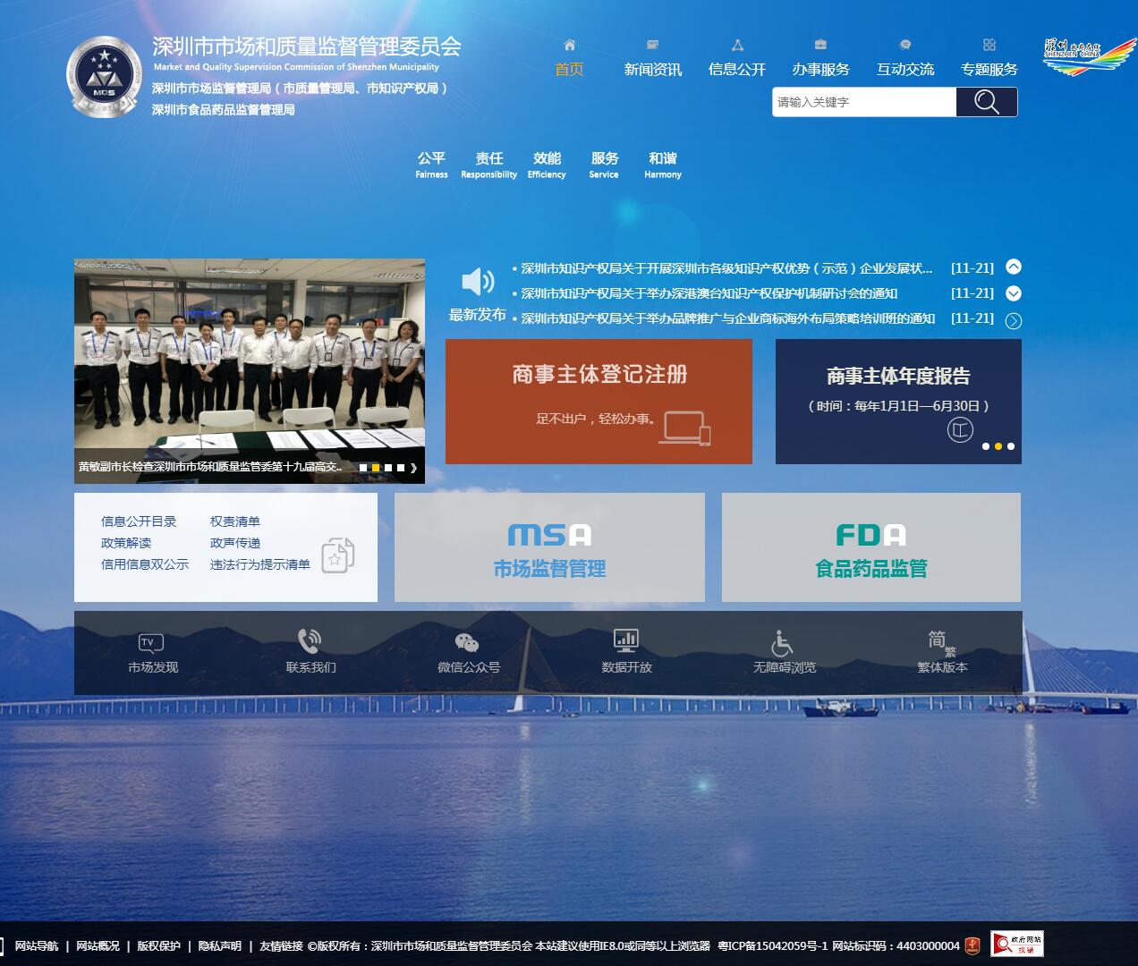 “深圳市市场和质量监督管理委员会门户网站”始终坚持以建设服务型网上政府为总目标,始终坚持以人为本、以用户为中心、以需求为导向,始终坚持把为用户提供办事服务作为出发点和落脚点,不断将网站打造成为本委提供行政办事服务和公共服务的第一窗口,权威发布政府信息的第一平台及政务公开的主渠道。