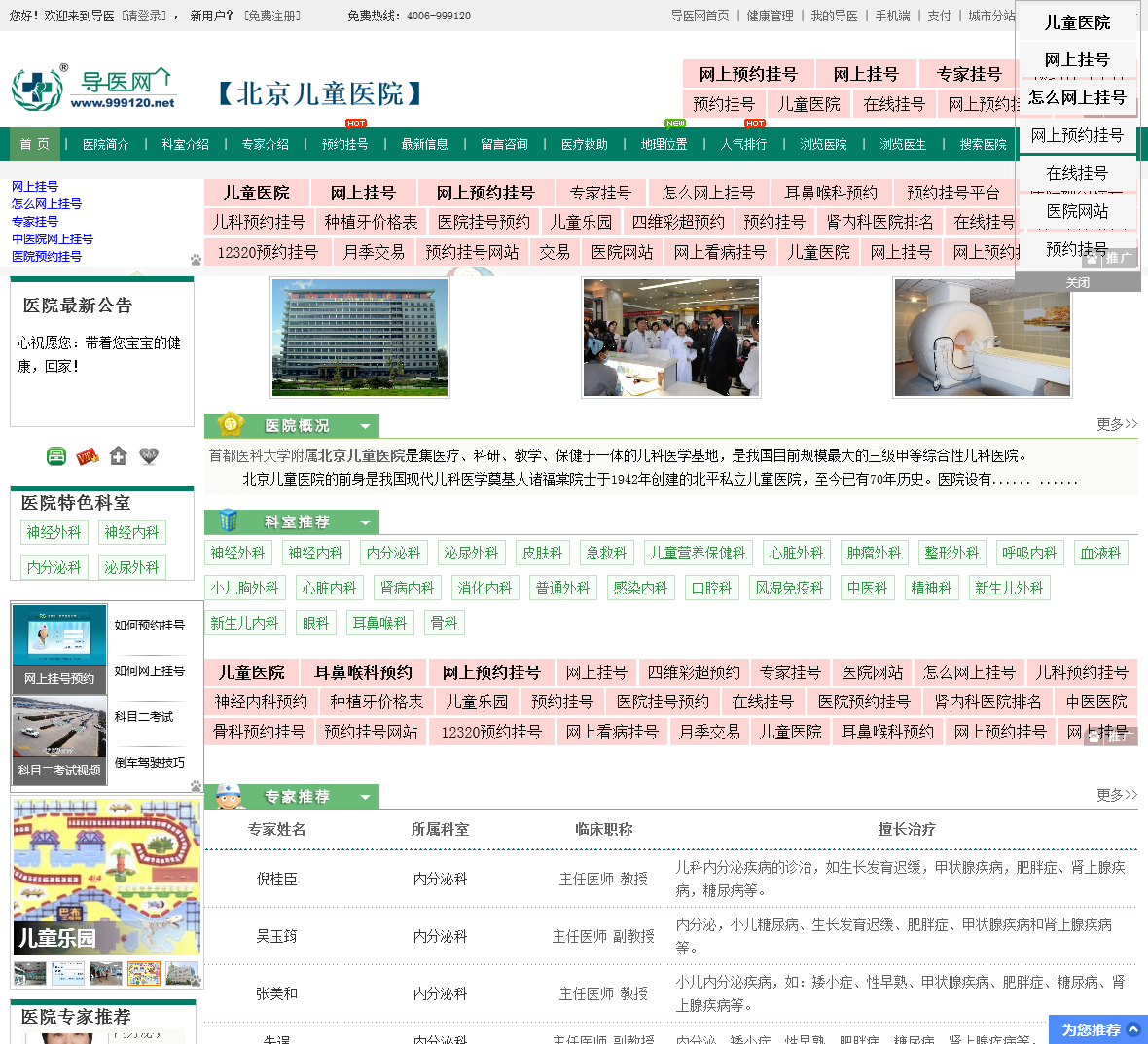 北京儿童医院预约挂号为您提供本医院的网上挂号服务,中国导医致力于为患者寻找对口的医院,中国导医致力于打造全国免费网上预约挂号服务平台,免费预约电话:4006999120。