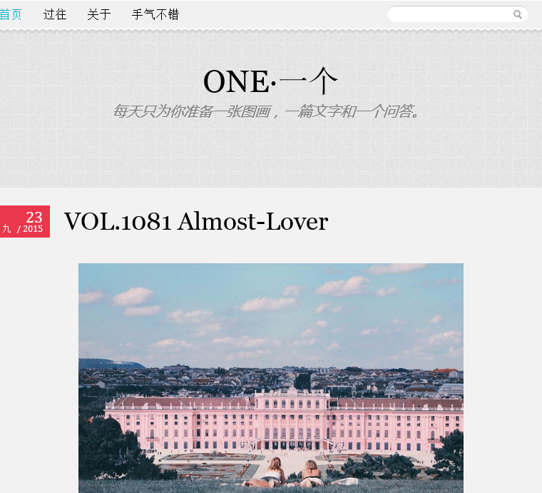 ONE·一个于2020-06-01被0702投稿网收录,网站相关信息来自互联网或网友分享!由于(ONE·一个)网站内容动态属性,时刻在变动,本站无法保证(ONE·一个)网站内容真实可靠!请大家查阅时,谨慎选择、自辩真伪,感谢您的理解与支持。如果您在访问(ONE·一个)时发现:网址失效、或网站存在非法等相关内容,请及时联系我们,我们会第一时间处理。