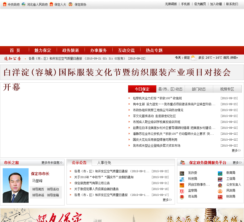 “中国保定”门户网站是保定市人民政府在国际互联网上建立的政府综合门户网站;是全市各级政府机关公用的信息综合平台;是保定市电子政务建设的重要组成部分。