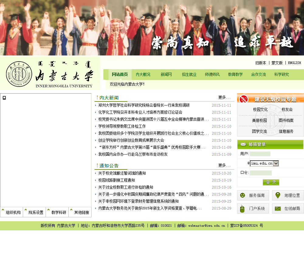 内蒙古大学于2020-06-14被0702投稿网收录,网站相关信息来自互联网或网友分享!由于(内蒙古大学)网站内容动态属性,时刻在变动,本站无法保证(内蒙古大学)网站内容真实可靠!请大家查阅时,谨慎选择、自辩真伪,感谢您的理解与支持。如果您在访问(内蒙古大学)时发现:网址失效、或网站存在非法等相关内容,请及时联系我们,我们会第一时间处理。