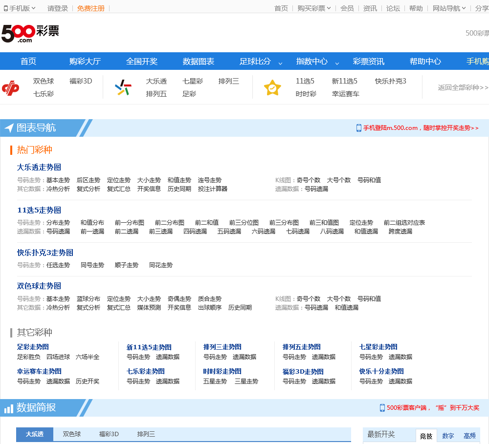 【500彩票网免费提供彩票走势图大全】包括福彩走势图、体彩走势图、足彩走势图、高频彩走势图等,方便彩民浏览、投注参考之用。