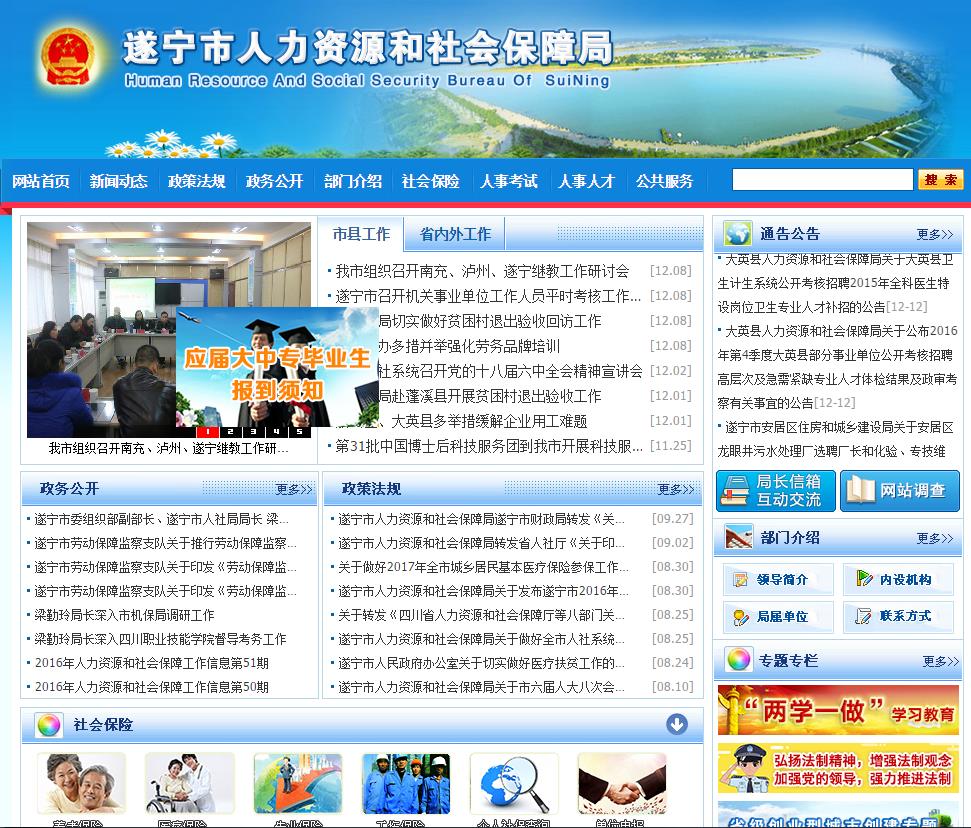 遂宁市人力资源和社会保障局网站是遂宁市人力资源和社会保障局为方便社会各界了解人力资源和社会保障政策,办理人力资源和社会保障相关事项而建立的公共信息网站。公众可通过网站了解有关人力资源和社会保障业务的办事程序、咨询相关的政策法规、举报违反人力资源和社会保障法律法规的行为、监督人力资源和社会保...