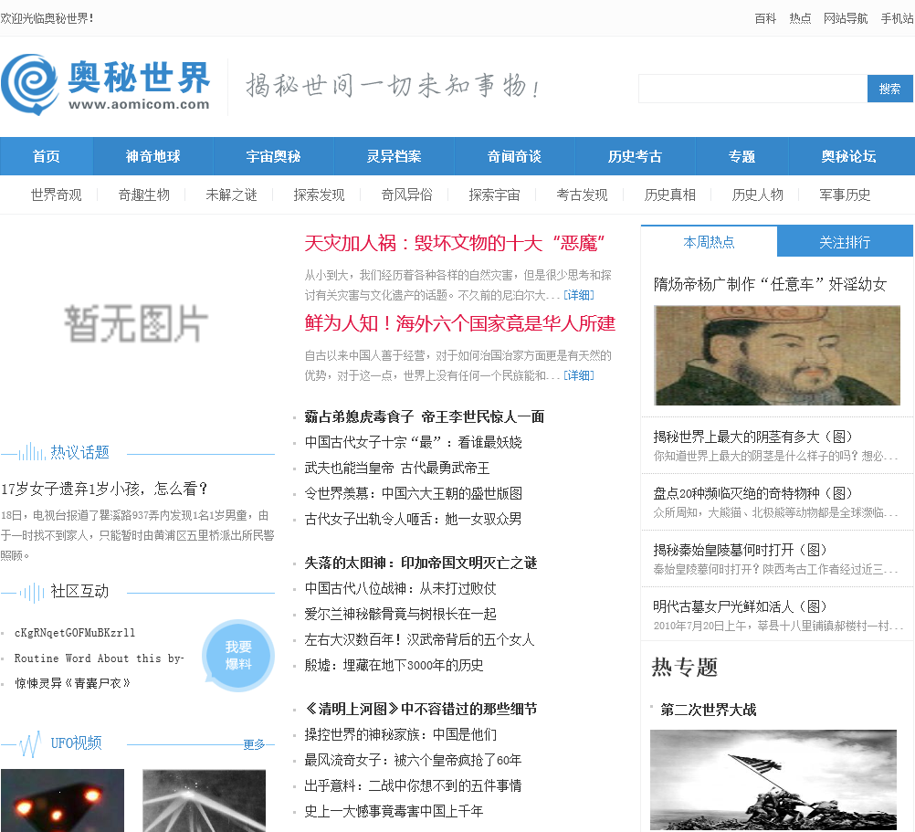 奥秘世界于2020-06-26被0702投稿网收录,网站相关信息来自互联网或网友分享!由于(奥秘世界)网站内容动态属性,时刻在变动,本站无法保证(奥秘世界)网站内容真实可靠!请大家查阅时,谨慎选择、自辩真伪,感谢您的理解与支持。如果您在访问(奥秘世界)时发现:网址失效、或网站存在非法等相关内容,请及时联系我们,我们会第一时间处理。