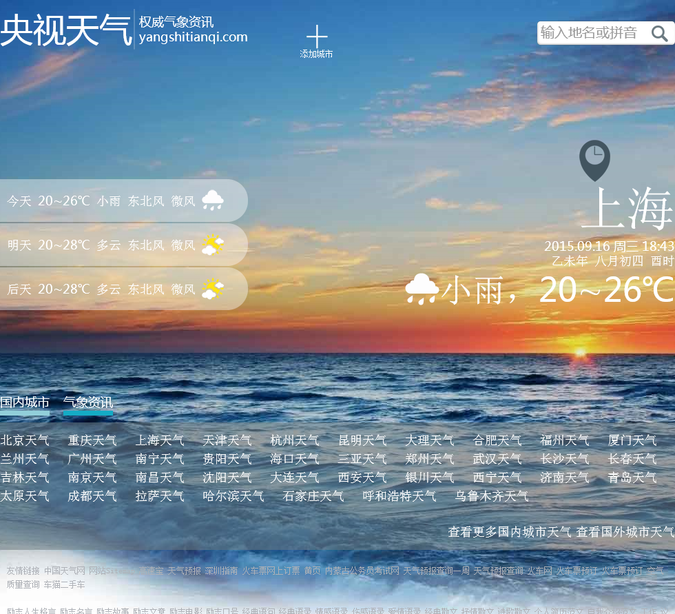 央视天气预报直播于2020-06-26被0702投稿网收录,网站相关信息来自互联网或网友分享!由于(央视天气预报直播)网站内容动态属性,时刻在变动,本站无法保证(央视天气预报直播)网站内容真实可靠!请大家查阅时,谨慎选择、自辩真伪,感谢您的理解与支持。如果您在访问(央视天气预报直播)时发现:网址失效、或网站存在非法等相关内容,请及时联系我们,我们会第一时间处理。
