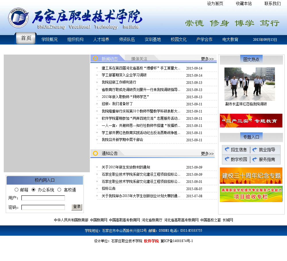 石家庄职业技术学院于2020-06-27被0702投稿网收录,网站相关信息来自互联网或网友分享!由于(石家庄职业技术学院)网站内容动态属性,时刻在变动,本站无法保证(石家庄职业技术学院)网站内容真实可靠!请大家查阅时,谨慎选择、自辩真伪,感谢您的理解与支持。如果您在访问(石家庄职业技术学院)时发现:网址失效、或网站存在非法等相关内容,请及时联系我们,我们会第一时间处理。