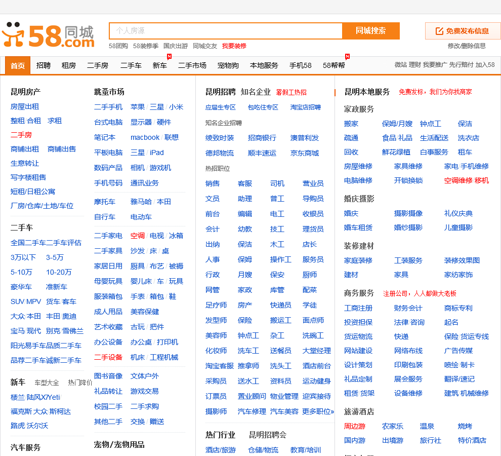 58同城昆明分类信息网,为你提供房产、招聘、黄页、团购、交友、二手、宠物、车辆、周边游等海量分类信息,充分满足您免费查看/发布信息的需求。昆明58同城,专业的分类信息网。