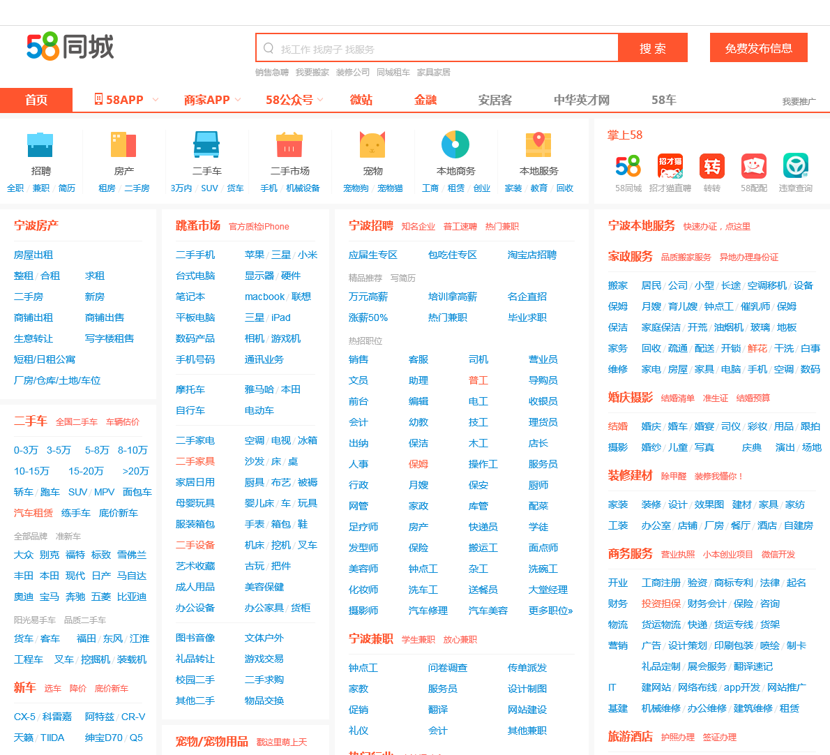 58同城宁波分类信息网,为你提供房产、招聘、黄页、团购、交友、二手、宠物、车辆、周边游等海量分类信息,充分满足您免费查看/发布信息的需求。宁波58同城,专业的分类信息网。