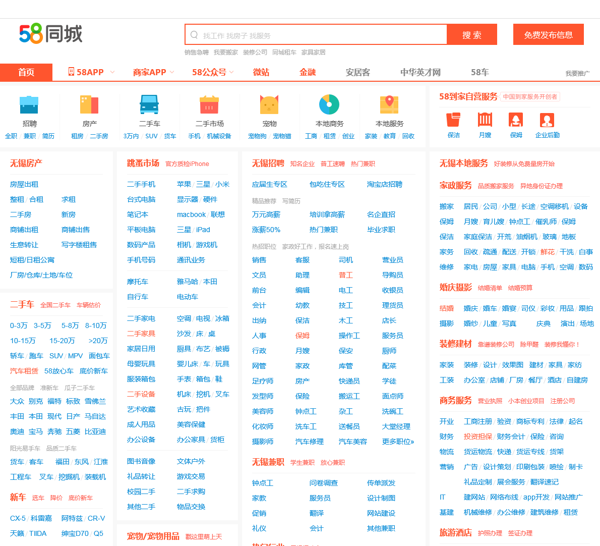 58同城无锡分类信息网,为你提供房产、招聘、黄页、团购、交友、二手、宠物、车辆、周边游等海量分类信息,充分满足您免费查看/发布信息的需求。无锡58同城,专业的分类信息网。