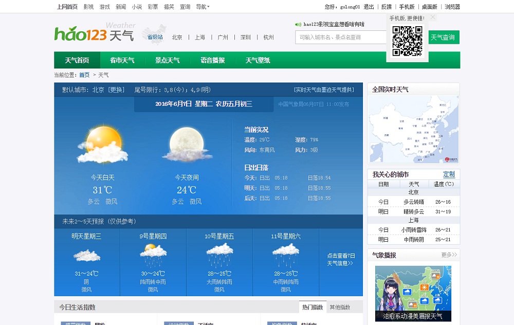 hao123天气预报查询提供全国天气预报15天查询、全国天气预报一周查询,让您及时了解全国城市3天、一周、15天天气预报,查询精准的一周天气预报、15天天气预报查询就上hao123天气预报查询频道。