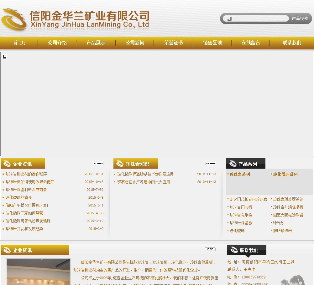 信阳金华兰矿业有限公司是以膨胀珍珠岩、珍珠岩板、玻化微珠、珍珠岩保温板、珍珠岩助滤剂、沸石、膨润土为主的集产品的开发、生产、销售为一体的高科技现代化企业。