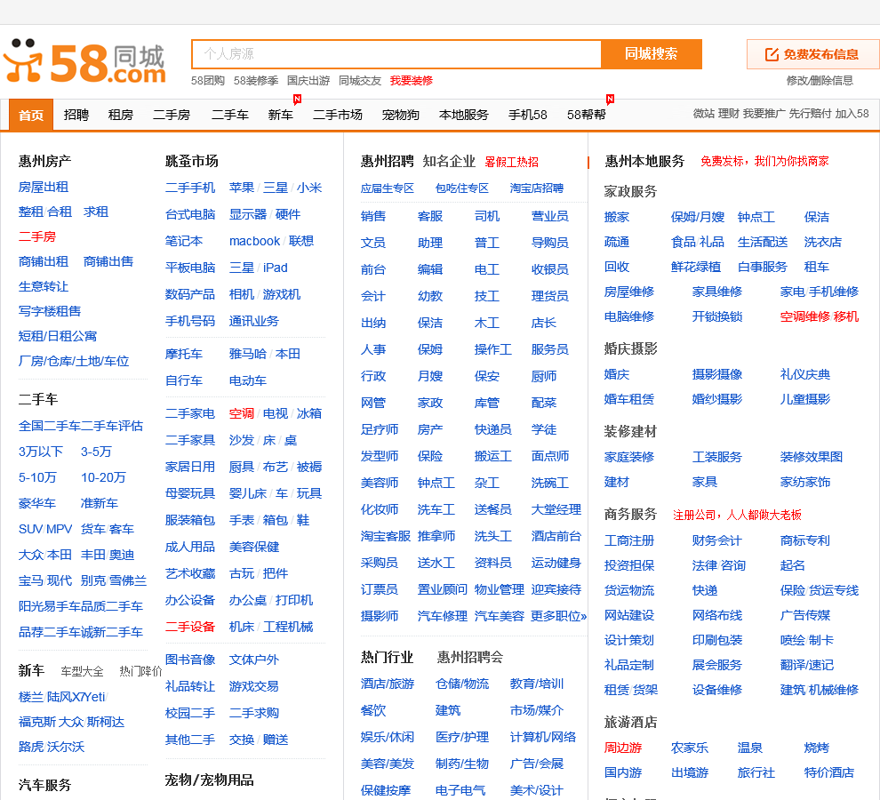 58同城惠州分类信息网,为你提供房产、招聘、黄页、团购、交友、二手、宠物、车辆、周边游等海量分类信息,充分满足您免费查看/发布信息的需求。惠州58同城,专业的分类信息网。