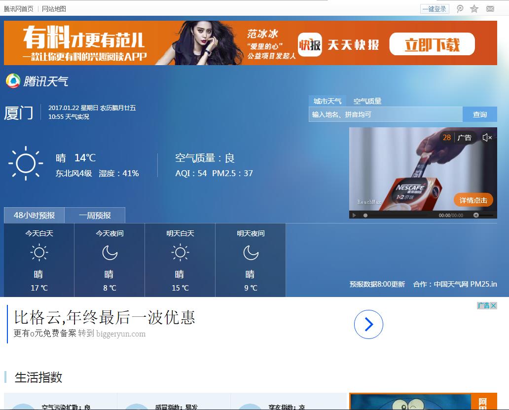腾讯天气频道于2020-07-04被0702投稿网收录,网站相关信息来自互联网或网友分享!由于(腾讯天气频道)网站内容动态属性,时刻在变动,本站无法保证(腾讯天气频道)网站内容真实可靠!请大家查阅时,谨慎选择、自辩真伪,感谢您的理解与支持。如果您在访问(腾讯天气频道)时发现:网址失效、或网站存在非法等相关内容,请及时联系我们,我们会第一时间处理。