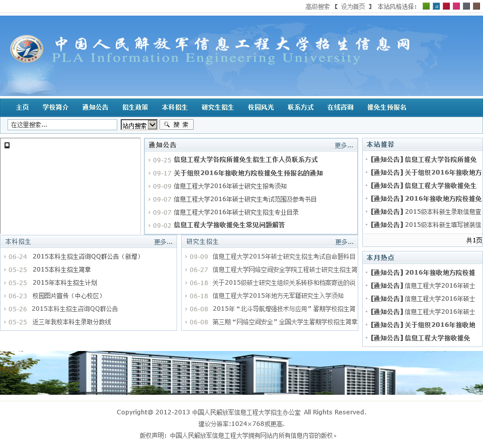 中国人民解放军信息工程大学招生信息网于2020-07-05被0702投稿网收录,网站相关信息来自互联网或网友分享!由于(中国人民解放军信息工程大学招生信息网)网站内容动态属性,时刻在变动,本站无法保证(中国人民解放军信息工程大学招生信息网)网站内容真实可靠!请大家查阅时,谨慎选择、自辩真伪,感谢您的理解与支持。如果您在访问(中国人民解放军信息工程大学招生信息网)时发现:网址失效、或网站存在非法等相关内容,请及时联系我们,我们会第一时间处理。