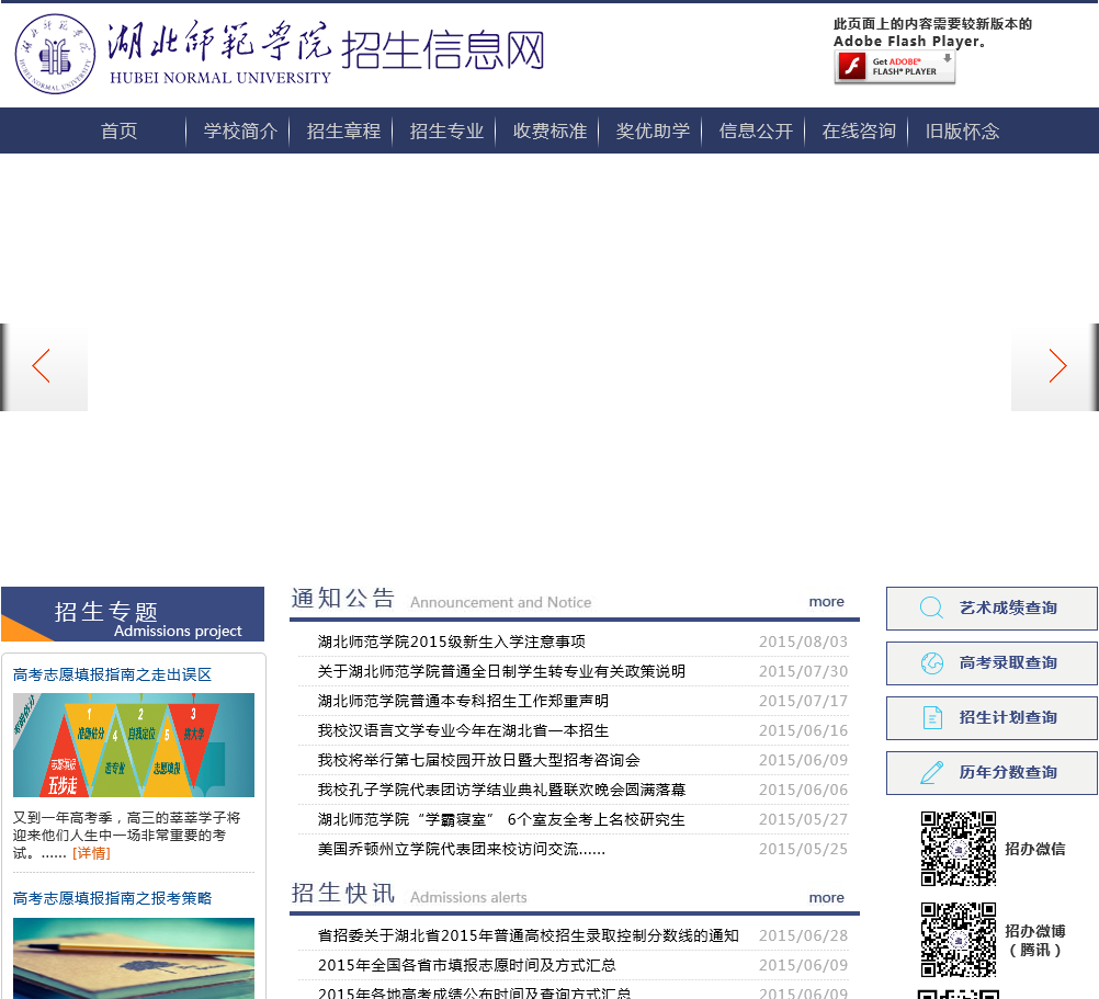 湖北师范学院招生网是湖北师范学院官方网站下的招生专网,主要针对想报考湖北师范学院的考生,发布各类本科招生信息。