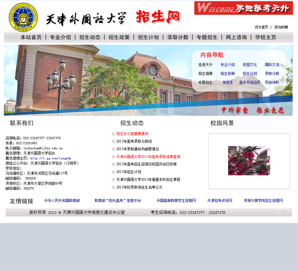 天津外国语大学---招生网于2020-07-08被0702投稿网收录,网站相关信息来自互联网或网友分享!由于(天津外国语大学---招生网)网站内容动态属性,时刻在变动,本站无法保证(天津外国语大学---招生网)网站内容真实可靠!请大家查阅时,谨慎选择、自辩真伪,感谢您的理解与支持。如果您在访问(天津外国语大学---招生网)时发现:网址失效、或网站存在非法等相关内容,请及时联系我们,我们会第一时间处理。
