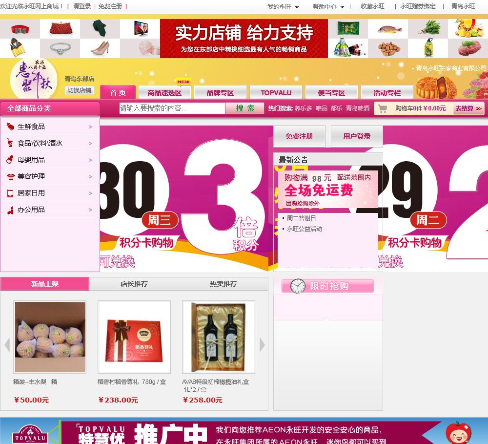 永旺(aeon)网上购物超市是由日本永旺集团旗下连锁零售集团打造的网上零售购物商城,为青岛,烟台,威海地区提供大的优质网上购物超市,包含生鲜食品,母婴用品,数码家电,办公用品,美容护理等八大类近万种优质商品,我们承诺当天网上订购当天送货上门、货到付款,让您购物更便捷,更优惠