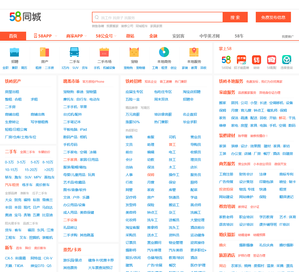58同城铁岭分类信息网,为你提供房产、招聘、黄页、团购、交友、二手、宠物、车辆、周边游等海量分类信息,充分满足您免费查看/发布信息的需求。铁岭58同城,专业的分类信息网。