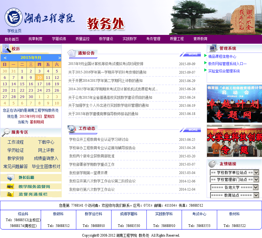 湖南工程学院教务处是学院主管教育教学工作的职能部门,也是学校领导在教学业务方面的参谋机构.在学院统一领导下,教务处本着“计划、检查、协调、服务”的宗旨,围绕学院的发展目标,以不断深化教育教学改革、提高教育教学质量为重点,强化服务意识,提升服务质量,努力为学院的发展做出自己的贡献。