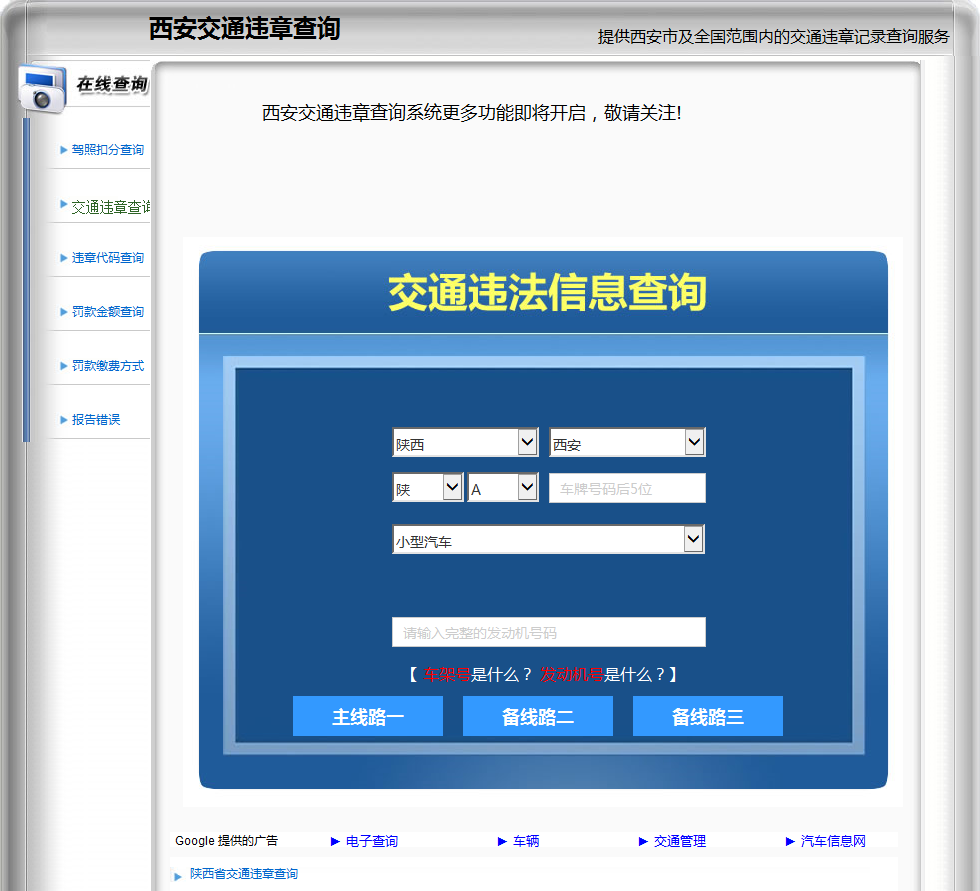 西安违章查询网于2020-07-18被0702投稿网收录,网站相关信息来自互联网或网友分享!由于(西安违章查询网)网站内容动态属性,时刻在变动,本站无法保证(西安违章查询网)网站内容真实可靠!请大家查阅时,谨慎选择、自辩真伪,感谢您的理解与支持。如果您在访问(西安违章查询网)时发现:网址失效、或网站存在非法等相关内容,请及时联系我们,我们会第一时间处理。