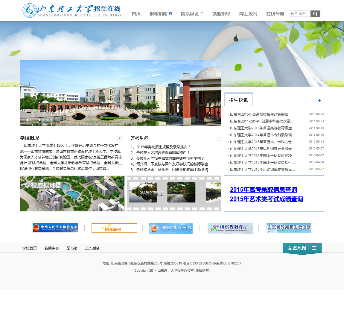 山东理工大学 招生在线是山东理工大学 官方网站下的招生专网,主要针对想报考山东理工大学 的考生,发布各类招生信息。