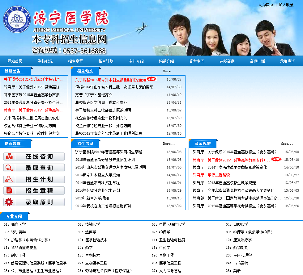 济宁医学院招生网是济宁医学院官方网站下的招生专网,主要针对想报考济宁医学院的考生,发布各类本专科招生信息。